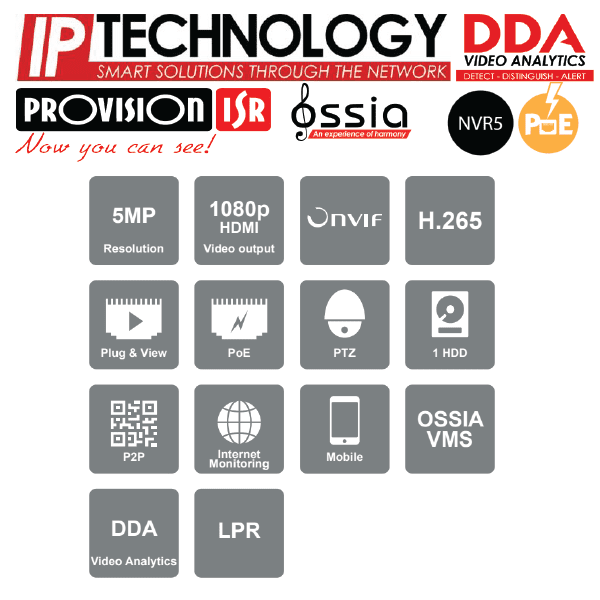 מערכת הקלטה 4 ערוצים PROVISION NVR דגם NVR5-4100PX+(MM) משולב PoE-Power Over Enternet (אין צורך ספק מתח נפרד למצלמות). HDMI/VGA (1080P, 1280×1024, 1024×768). דיסק קשיח 1T וניתן להרחבה עד 6TB.