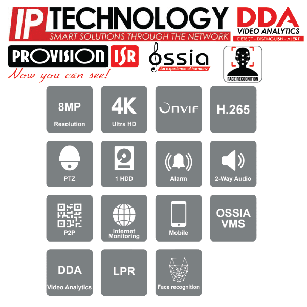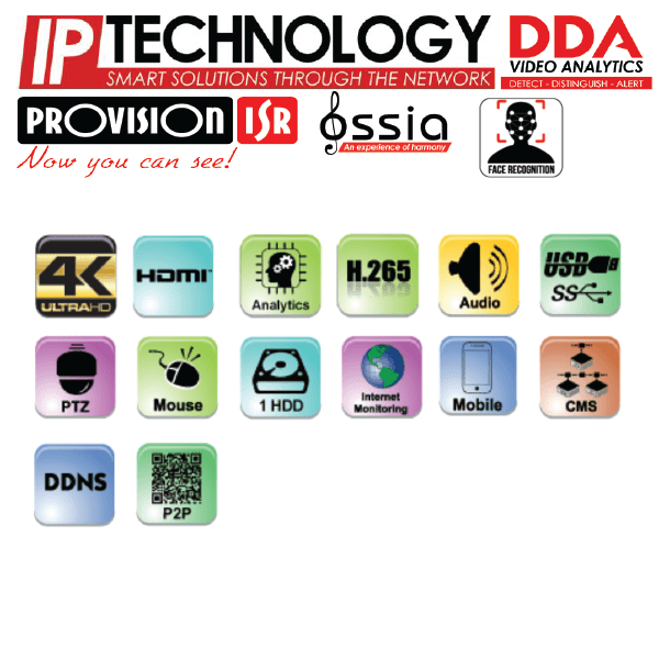 מערכת הקלטה 8 ערוצים PROVISION NVR דגם NVR12-8200FAN רזולוציה 8MP . אנליטיקה מתקדמת DDA, זיהוי פנים. : HDMI (4K,1080P) VGA (1280X1024). דיסק קשיח 1T ניתן להרחבה עד 8TB