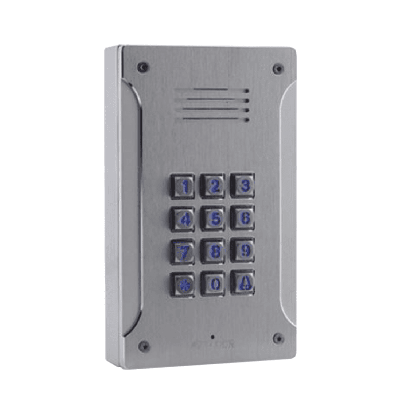 פנל אינטרקום חיצוני, עשוי מתכת אנטי ונדלי, המשולב מקודד מואר להתקנה על הטיח. קודן מואר המאפשר פתיחת דלת/מנעול שער באמצעות קוד משתמש (תכנות עד 98 קודי תשמש). ניתן לתכנות זמן ממסר עד 99 שניות. חיבור 2 גידים LINE למתאם טלפון